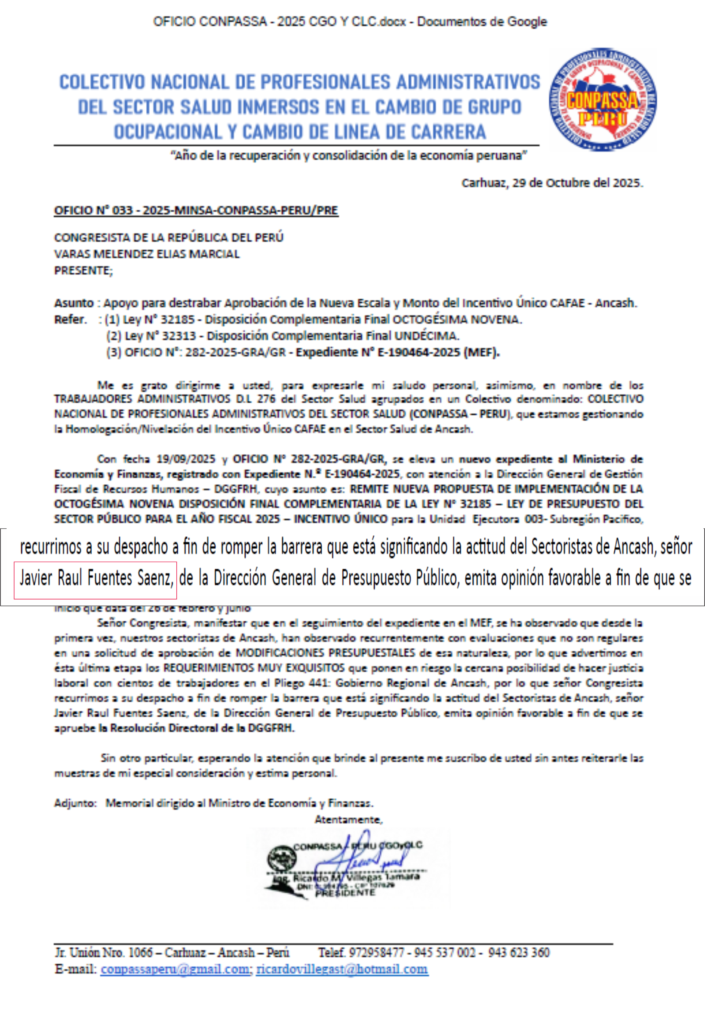 Dirigentes y trabajadores denuncian públicamente que el expediente técnico y presupuestal presentado por el Gobierno Regional de Áncash (GORE Áncash) al MEF viene siendo bloqueado por decisiones del funcionario Javier Raúl Fuentes Sáenz, sectorista asignado al pliego Áncash de la Dirección General de Presupuesto Público del MEF.